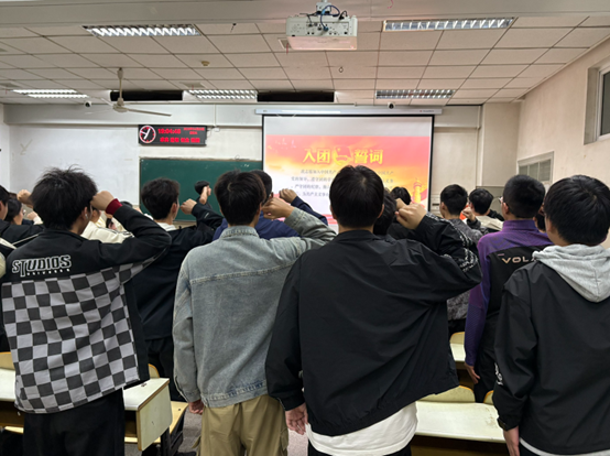 活动最后,全体团员高举右拳,庄严重温入团誓词,铮铮誓言响彻教室,将现场氛围推向高潮,进一步强化了团员的身份认同、责任意识与集体荣誉感。团支部负责人勉励全体团员践行入团誓词,牢记初心使命,以坚定的信念、昂扬的姿态迎接挑战,展现新作为。
